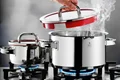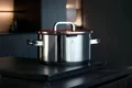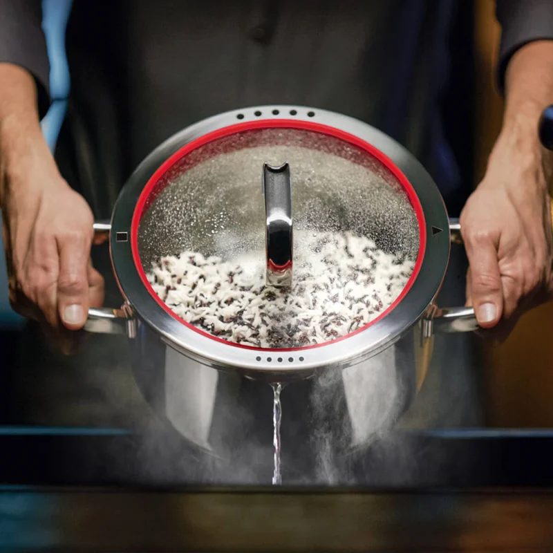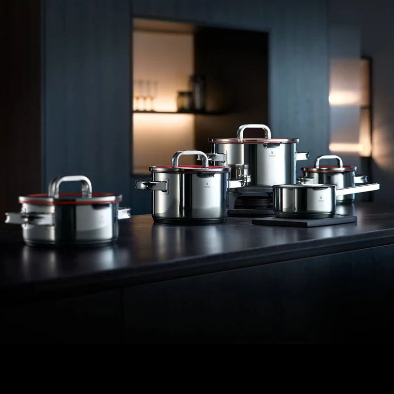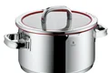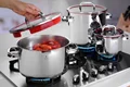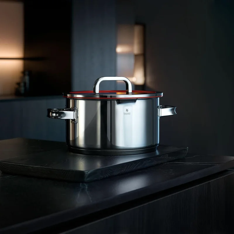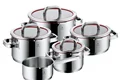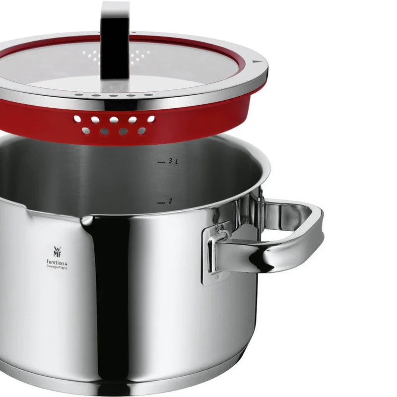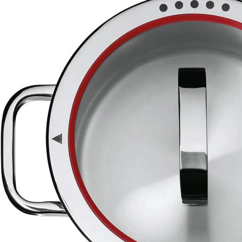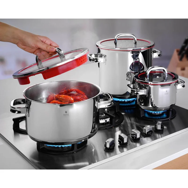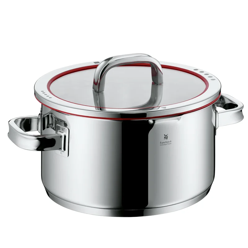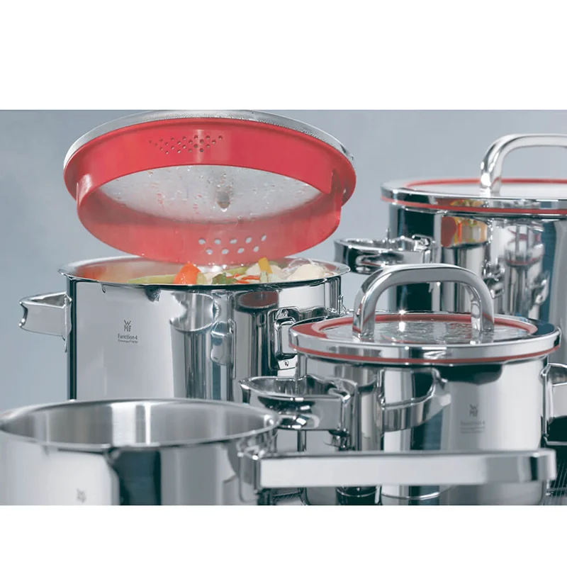 سرویس قابلمه 9 پارچه دبلیو ام اف مدل WMF Fanction4 از 9 قطعه ساخته شده از فولاد ضد زنگ درب آن از سیلیکون و شیشه است و دارای 4 نوع خروجی آب و بخار می باشد که سیلیکون درب مقاوم در برابر حرارت است و همچنین دسته های قابلمه در طول پخت و پز داغ نمی شوند ، غذای خود را هنگام پخت به دلیل درب شیشه ای به راحتی کنترل کنید . داخل قابلمه ها درجه بندی مشخص شده را برای آشپزی راحت تر می کند . کف سه لایه جهانی ثبت شده TransTherm به لطف توزیع و حفظ بهینه گرما ، هنگام پخت و پز در مصرف انرژی صرفه جویی می کند . قابلمه های WMF Fanction4 دارای دسته های توخالی هستند که انتقال حرارت را از قابلمه به دسته کاهش می دهند .