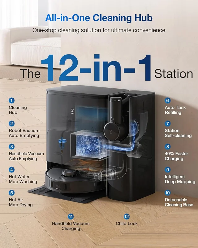 جارو رباتیک اکووکس مدل T30S-COMBO یک ابزار چندمنظوره است که شامل جارو رباتیک برای کف و جارو دستی برای سطوح مختلف است، که همه اینها در یک ایستگاه داکینگ مشترک قرار دارند. با قدرت مکش 11000Pa، فناوری تشخیص موانع 3D، سیستم ضد پیچ خوردگی ZeroTangle و قابلیت شستشوی هوشمند، این دستگاه تجربهای راحت و بدون دردسر از تمیزکاری به شما ارائه میدهد.