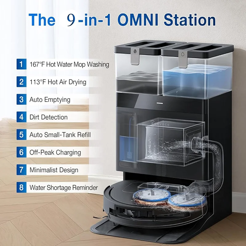 ایستگاه OMNI یک وسیله جانبی هوشمند برای جارو رباتیک شماست که تمام کارهای مربوط به تمیزکاری را به صورت خودکار انجام میدهد. این ایستگاه میتواند به طور خودکار گرد و غبار جمعآوری شده را تخلیه کند، پدهای شستشو را با هوای گرم 45 درجه سانتیگراد خشک نماید، مخزن آب را به صورت اتوماتیک پر کند و حتی در ساعات غیر اوج مصرف برق شارژ شود. همچنین، با داشتن اسکرابرهای دو جهته و قابلیت شستشو با آب داغ 70 درجه سانتیگراد، هم پدهای شستشو و هم خود ایستگاه را به صورت خودکار تمیز میکند. با ایستگاه OMNI، دیگر نیازی به دخالت دستی برای تمیزکاری نخواهید داشت و همیشه یک جاروبرقی آماده به کار و محیطی پاکیزه خواهید داشت.